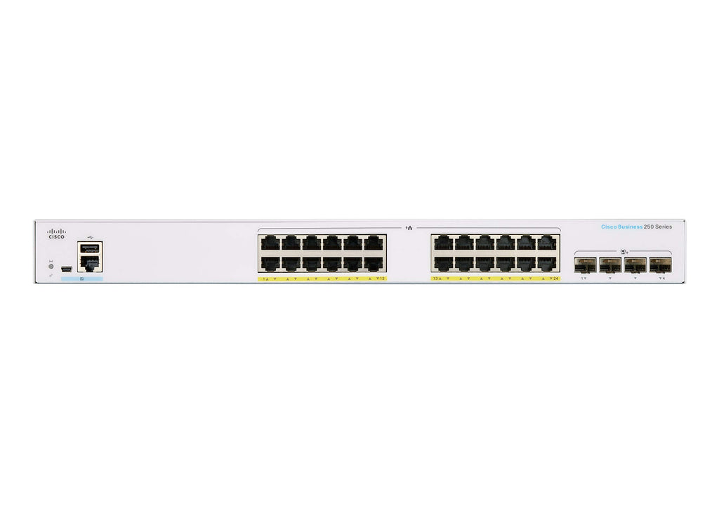 Power | Internal AC power supply (region-dependent); no built-in PoE on standard CBS250-24T-4X model |