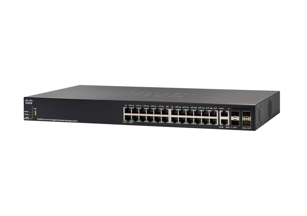 The Cisco SG350X-24-K9 is a high-performance Layer 3 managed switch designed to deliver reliable, secure, and scalable networking for businesses of all sizes. Featuring 24x 1GbE PoE+ ports and 2x combo 10GbE SFP+ plus 2x 10GbE SFP+ uplinks, it provides flexible connectivity for IP phones, access points, servers, and other network devices. With a total PoE budget of 370W, this switch powers multiple devices without additional adapters. Advanced features such as VLAN, QoS, link aggregation, IPv4/IPv6 support, and Layer 3 static routing ensure efficient traffic management, optimized performance, and enhanced network security. Its compact 1RU form factor allows for easy rack mounting, while intuitive management options via Web GUI, CLI, and SNMP simplify configuration and monitoring. Ideal for enterprise offices, branch locations, and small data centers, the Cisco SG350X-24-K9 combines high throughput, energy-efficient operation, and PoE+ convenience to meet modern networking demands and future growth.